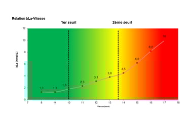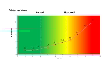 correspond à la première augmentation notable des variables physiologiques dans l'organisme. Le graphique ci-dessous illustre cette hausse (première cassure de la courbe = seuil lactique 1) lors d’un test d’effort incrémental sur tapis de course :